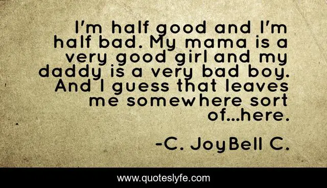 This page presents the quote "I'm half good and I'm half bad. My mama is a very good girl and my daddy is a very bad boy. And I guess that leaves me somewhere sort of...here.". Author of this quote is C. JoyBell C.. This quote is about life, good, humor, humorous, bad, good-and-evil, life-and-living, bad-boys,.