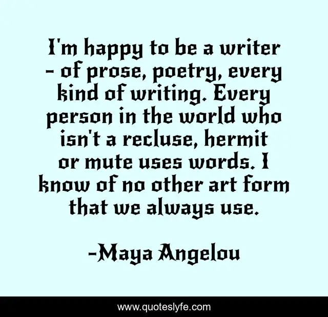This page presents the quote "I'm happy to be a writer - of prose, poetry, every kind of writing. Every person in the world who isn't a recluse, hermit or mute uses words. I know of no other art form that we always use.". Author of this quote is Maya Angelou. This quote is about art, words, happy,.