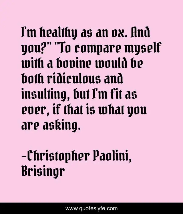 This page presents the quote "I'm healthy as an ox. And you?" "To compare myself with a bovine would be both ridiculous and insulting, but I'm fit as ever, if that is what you are asking.". Author of this quote is Christopher Paolini, Brisingr. This quote is about eragon, funny, comedy, saphira,.