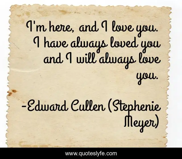 "Edward Cullen (Stephenie Meyer) Quotes." Quoteslyfe.com, 2025. Sat. 06 Dec. 2025. <https://www.quoteslyfe.com/quote/I-m-here-and-I-love-you-248462>.