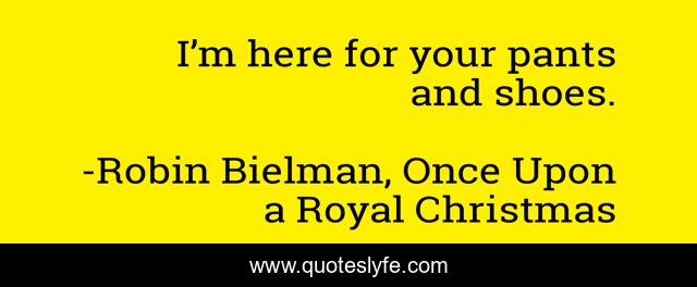 This page presents the quote "I’m here for your pants and shoes.". Author of this quote is Robin Bielman, Once Upon a Royal Christmas. This quote is about holiday-romance, royal-romance, christmas-romance, contemporary-romance,.