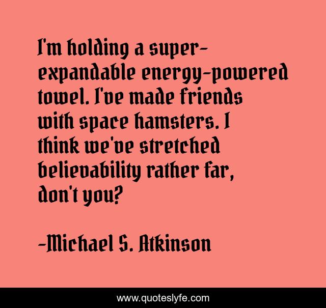 This page presents the quote "I'm holding a super-expandable energy-powered towel. I've made friends with space hamsters. I think we've stretched believability rather far, don't you?". Author of this quote is Michael S. Atkinson. This quote is about comedy, humour, princess-catrina,.