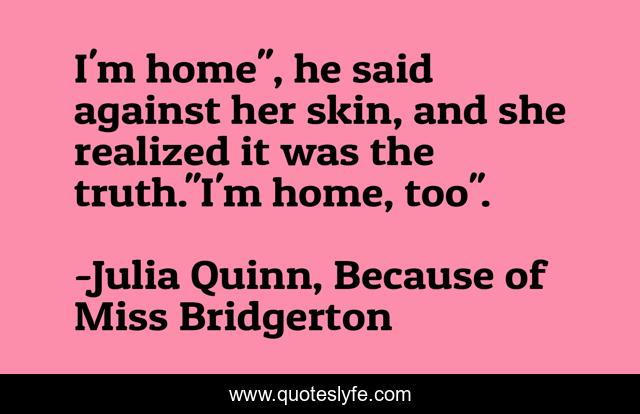 This page presents the quote "I'm home'', he said against her skin, and she realized it was the truth.''I'm home, too''.". Author of this quote is Julia Quinn, Because of Miss Bridgerton. This quote is about home, love, affection,.