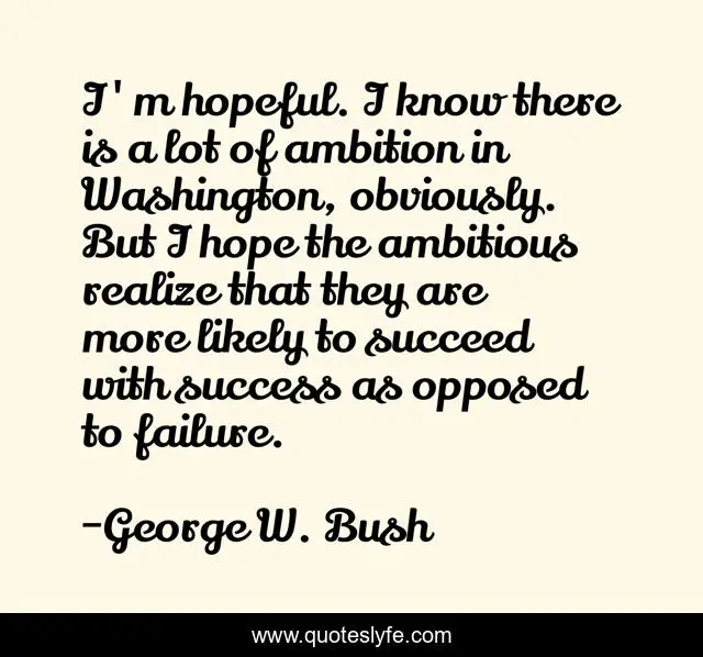 This page presents the quote "I'm hopeful. I know there is a lot of ambition in Washington, obviously. But I hope the ambitious realize that they are more likely to succeed with success as opposed to failure.". Author of this quote is George W. Bush. This quote is about success, hope, ambition,.