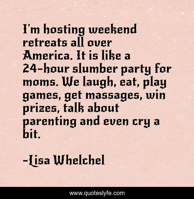 This page presents the quote "I'm hosting weekend retreats all over America. It is like a 24-hour slumber party for moms. We laugh, eat, play games, get massages, win prizes, talk about parenting and even cry a bit.". Author of this quote is Lisa Whelchel. This quote is about win, america, laugh,.