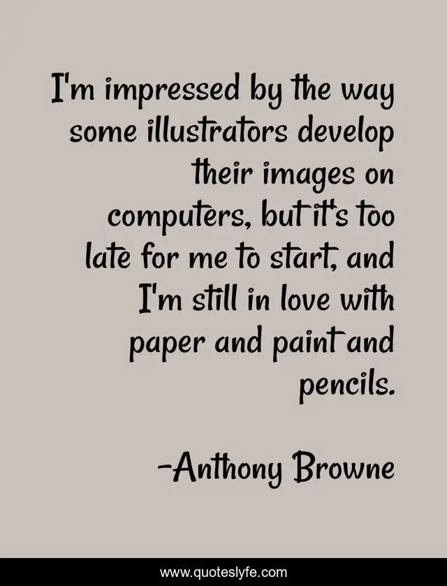 This page presents the quote "I'm impressed by the way some illustrators develop their images on computers, but it's too late for me to start, and I'm still in love with paper and paint and pencils.". Author of this quote is Anthony Browne. This quote is about me, start, love, affection,.