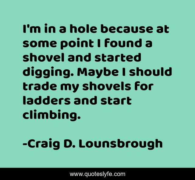 This page presents the quote "I'm in a hole because at some point I found a shovel and started digging. Maybe I should trade my shovels for ladders and start climbing.". Author of this quote is Craig D. Lounsbrough. This quote is about deciding, shovel, deliberation, trade, ladders, thoughtful, choosing, decisions, thoughtless,.