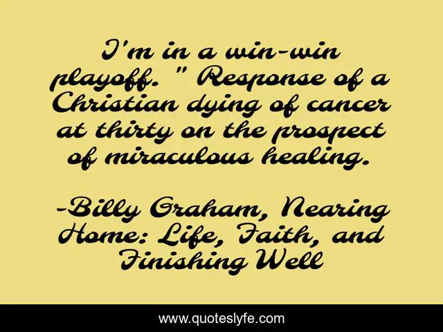 This page presents the quote "I'm in a win-win playoff. " Response of a Christian dying of cancer at thirty on the prospect of miraculous healing.". Author of this quote is Billy Graham, Nearing Home: Life, Faith, and Finishing Well. This quote is about contentment, victory,.