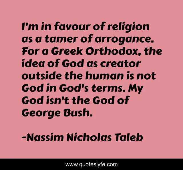 This page presents the quote "I'm in favour of religion as a tamer of arrogance. For a Greek Orthodox, the idea of God as creator outside the human is not God in God's terms. My God isn't the God of George Bush.". Author of this quote is Nassim Nicholas Taleb. This quote is about god, human, arrogance,.