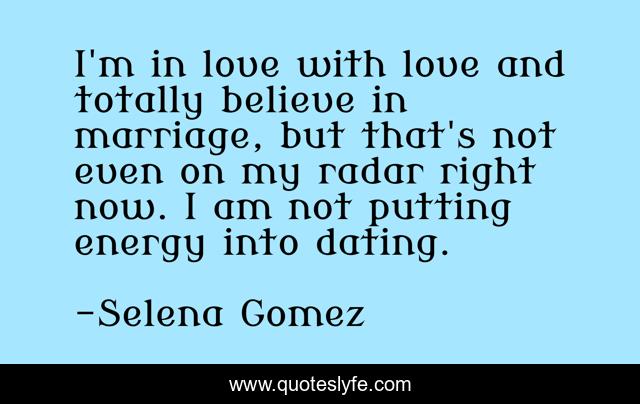 This page presents the quote "I'm in love with love and totally believe in marriage, but that's not even on my radar right now. I am not putting energy into dating.". Author of this quote is Selena Gomez. This quote is about dating, love, affection,.