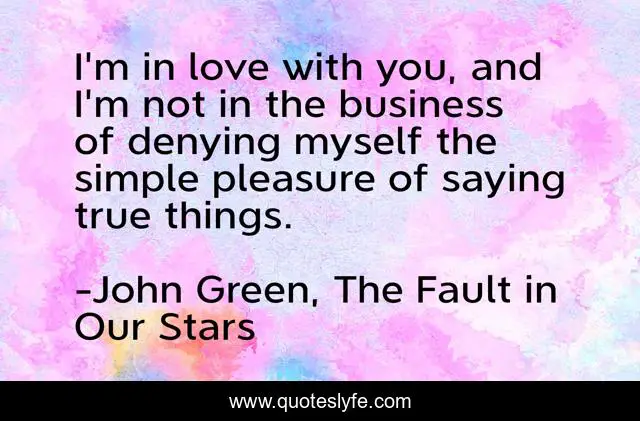 This page presents the quote "I'm in love with you, and I'm not in the business of denying myself the simple pleasure of saying true things.". Author of this quote is John Green, The Fault in Our Stars. This quote is about love, i, can-t, augustus-waters, augustus, have, an, true, why,.