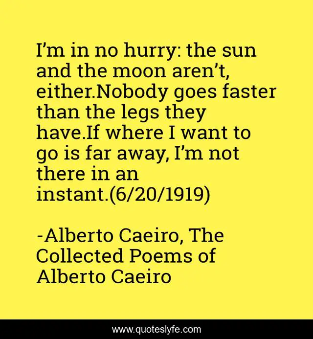 This page presents the quote "I’m in no hurry: the sun and the moon aren’t, either.Nobody goes faster than the legs they have.If where I want to go is far away, I’m not there in an instant.(6/20/1919)". Author of this quote is Alberto Caeiro, The Collected Poems of Alberto Caeiro. This quote is about pantheism, hurry, reality, sun, time, moon, it-is-what-it-is, meaning, growth,.
