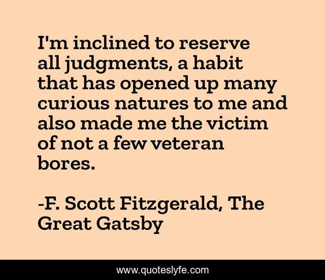 This page presents the quote "I'm inclined to reserve all judgments, a habit that has opened up many curious natures to me and also made me the victim of not a few veteran bores.". Author of this quote is F. Scott Fitzgerald, The Great Gatsby. .