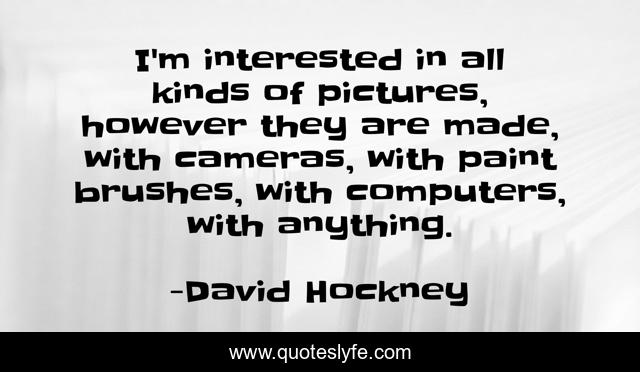 This page presents the quote "I'm interested in all kinds of pictures, however they are made, with cameras, with paint brushes, with computers, with anything.". Author of this quote is David Hockney. This quote is about paint, anything, pictures,.