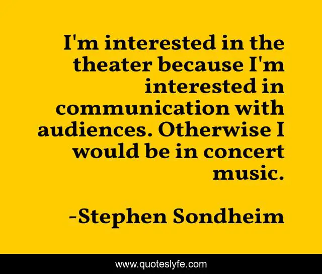This page presents the quote "I'm interested in the theater because I'm interested in communication with audiences. Otherwise I would be in concert music.". Author of this quote is Stephen Sondheim. This quote is about music, theater, concert,.