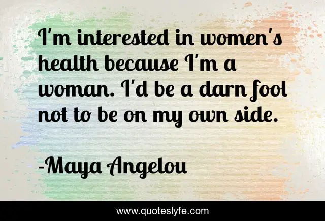 This page presents the quote "I'm interested in women's health because I'm a woman. I'd be a darn fool not to be on my own side.". Author of this quote is Maya Angelou. This quote is about fool, woman, women,.