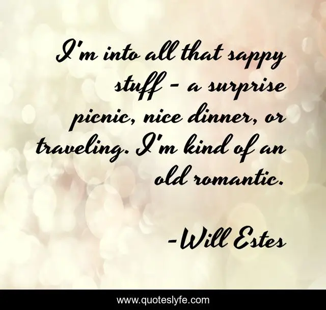 This page presents the quote "I'm into all that sappy stuff - a surprise picnic, nice dinner, or traveling. I'm kind of an old romantic.". Author of this quote is Will Estes. This quote is about surprise, dinner, nice,.