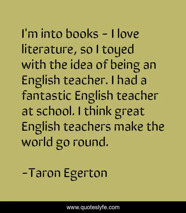 This page presents the quote "I'm into books - I love literature, so I toyed with the idea of being an English teacher. I had a fantastic English teacher at school. I think great English teachers make the world go round.". Author of this quote is Taron Egerton. This quote is about great, love, school, affection,.