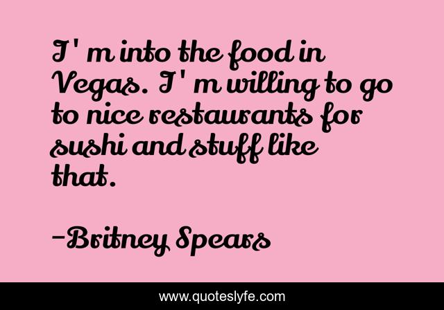 This page presents the quote "I'm into the food in Vegas. I'm willing to go to nice restaurants for sushi and stuff like that.". Author of this quote is Britney Spears. This quote is about vegas, sushi, nice,.