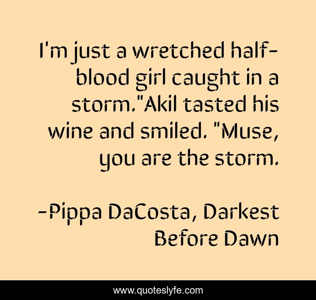This page presents the quote "I'm just a wretched half-blood girl caught in a storm."Akil tasted his wine and smiled. "Muse, you are the storm.". Author of this quote is Pippa DaCosta, Darkest Before Dawn. This quote is about the-veil-series, pippa-dacosta, urban-fantasy, muse, beyond-the-veil, muse-to-akil, akil-to-muse, akil,.