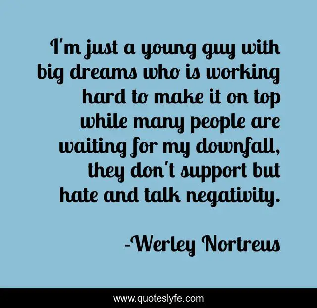 This page presents the quote "I'm just a young guy with big dreams who is working hard to make it on top while many people are waiting for my downfall, they don't support but hate and talk negativity.". Author of this quote is Werley Nortreus. This quote is about negative-people, enthusiasm, hateful, inspirational, racism,.