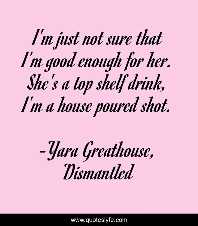 This page presents the quote "I'm just not sure that I'm good enough for her. She's a top shelf drink, I'm a house poured shot.". Author of this quote is Yara Greathouse, Dismantled. This quote is about romance, friendship-and-love, suspense, hardship,.