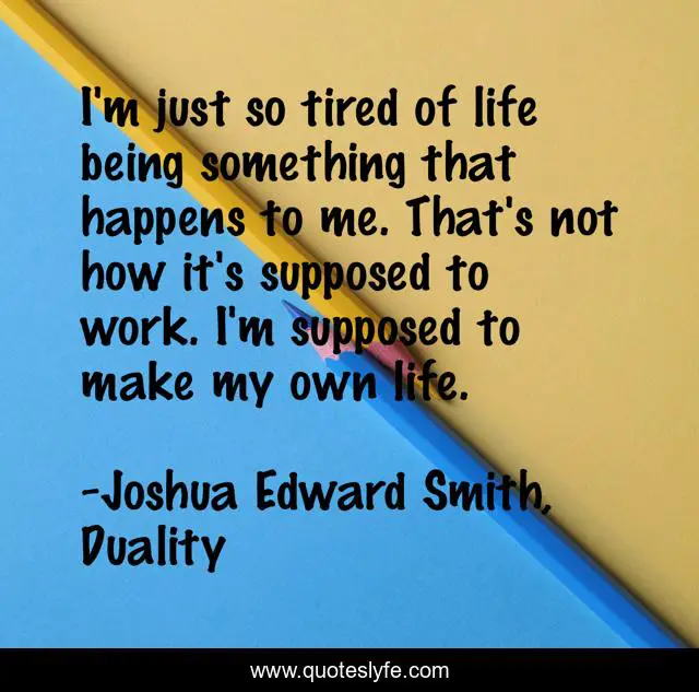 This page presents the quote "I'm just so tired of life being something that happens to me. That's not how it's supposed to work. I'm supposed to make my own life.". Author of this quote is Joshua Edward Smith, Duality. This quote is about happens, me, life, duality, tired, i, quote, to,.