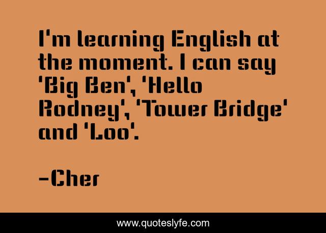 This page presents the quote "I'm learning English at the moment. I can say 'Big Ben', 'Hello Rodney', 'Tower Bridge' and 'Loo'.". Author of this quote is Cher. This quote is about bridge, moment, i can,.