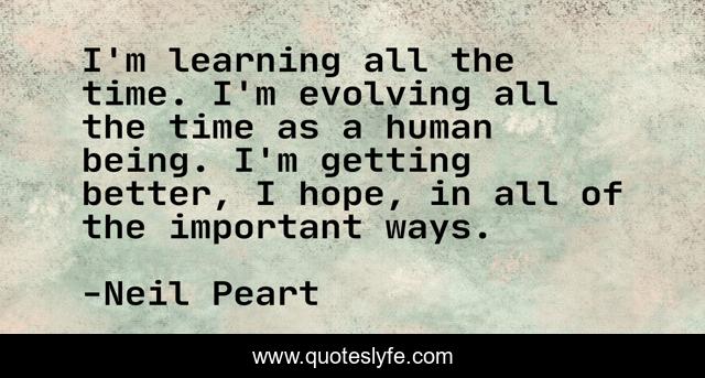This page presents the quote "I'm learning all the time. I'm evolving all the time as a human being. I'm getting better, I hope, in all of the important ways.". Author of this quote is Neil Peart. This quote is about better, hope, time,.