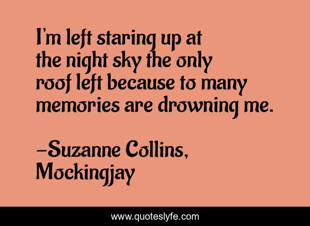 This page presents the quote "I'm left staring up at the night sky the only roof left because to many memories are drowning me.". Author of this quote is Suzanne Collins, Mockingjay. This quote is about memories, depression,.