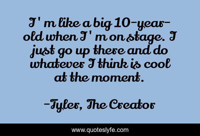 This page presents the quote "I'm like a big 10-year-old when I'm on stage. I just go up there and do whatever I think is cool at the moment.". Author of this quote is Tyler, The Creator. This quote is about moment, think, up,.