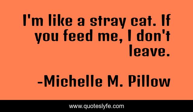 This page presents the quote "I'm like a stray cat. If you feed me, I don't leave.". Author of this quote is Michelle M. Pillow. This quote is about feeding, humor, stray, food, author-life, michelle-pillow, cat, humorous, houseguest,.