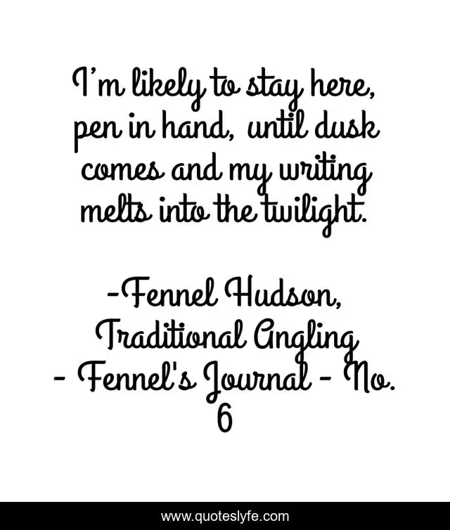 This page presents the quote "I’m likely to stay here, pen in hand, until dusk comes and my writing melts into the twilight.". Author of this quote is Fennel Hudson, Traditional Angling - Fennel's Journal - No. 6. This quote is about nature, outdoors, author, writing,.