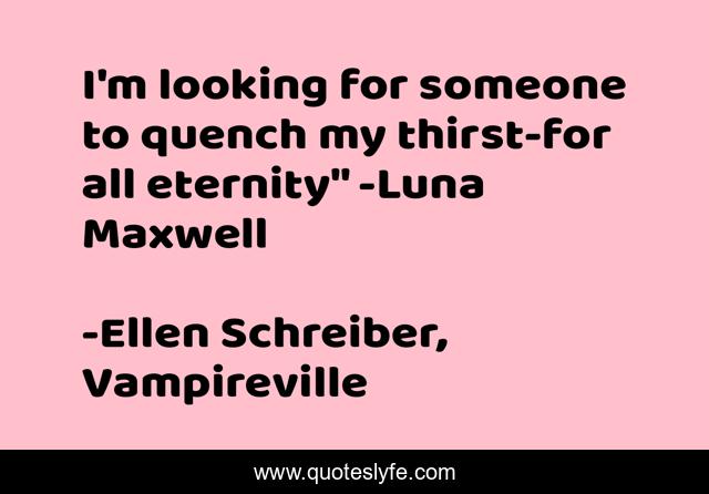 This page presents the quote "I'm looking for someone to quench my thirst-for all eternity" -Luna Maxwell". Author of this quote is Ellen Schreiber, Vampireville. This quote is about vampire, vampireville, luna, thirst, blood,.
