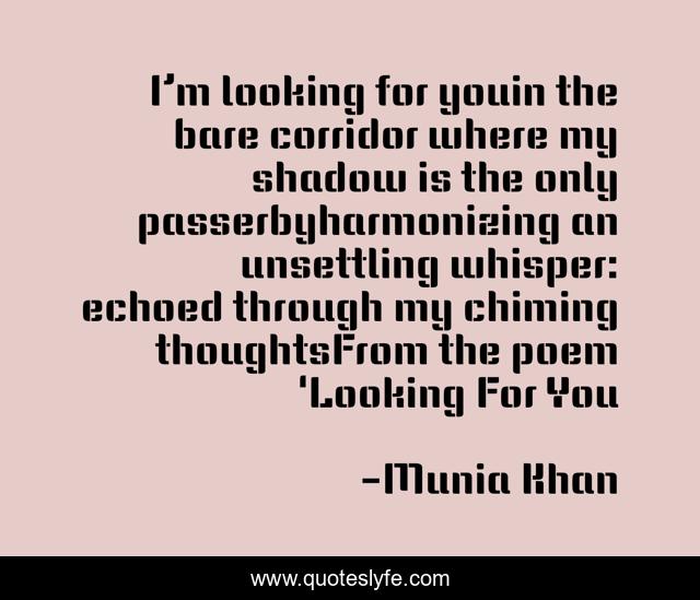 This page presents the quote "I’m looking for youin the bare corridor where my shadow is the only passerbyharmonizing an unsettling whisper: echoed through my chiming thoughtsFrom the poem 'Looking For You". Author of this quote is Munia Khan. This quote is about shadows, chimes, passerby, looking-for, harmonizing, whisper, poetry, echo, thought,.
