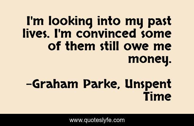 This page presents the quote "I'm looking into my past lives. I'm convinced some of them still owe me money.". Author of this quote is Graham Parke, Unspent Time. This quote is about weird, philosophy, humor,.