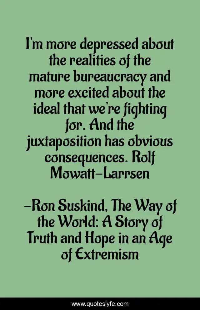 This page presents the quote "I'm more depressed about the realities of the mature bureaucracy and more excited about the ideal that we're fighting for. And the juxtaposition has obvious consequences. Rolf Mowatt-Larrsen". Author of this quote is Ron Suskind, The Way of the World: A Story of Truth and Hope in an Age of Extremism. This quote is about goalsetting, passion, status-quo, vision,.