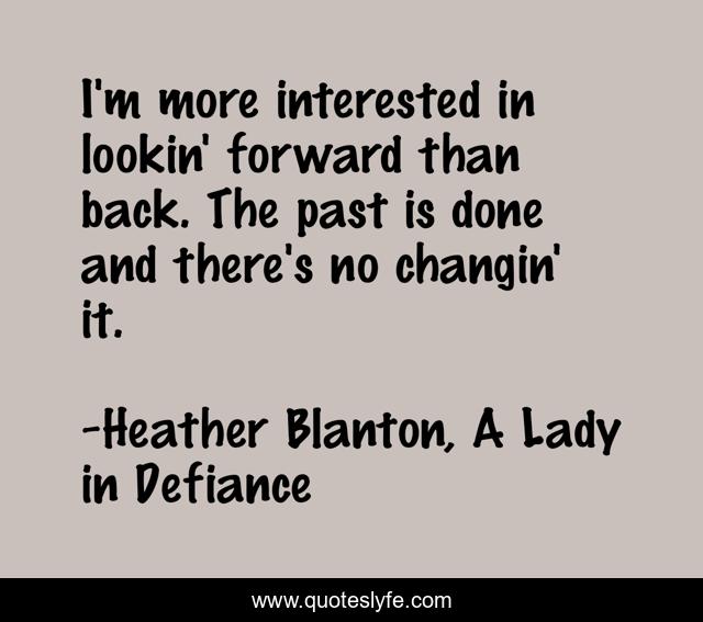 This page presents the quote "I'm more interested in lookin' forward than back. The past is done and there's no changin' it.". Author of this quote is Heather Blanton, A Lady in Defiance. This quote is about enthusiasm, christian, western-historical-romance, inspirational,.