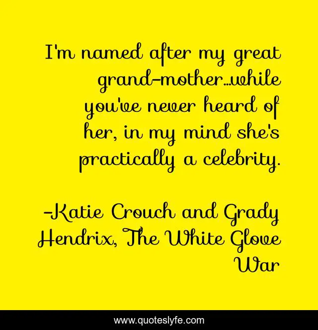 "Katie Crouch and Grady Hendrix, The White Glove War Quotes." Quoteslyfe.com, 2025. Sun. 07 Dec. 2025. <https://www.quoteslyfe.com/quote/I-m-named-after-my-great-grand-133666>.