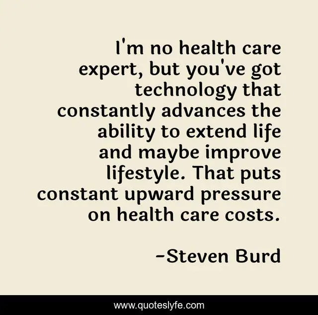 This page presents the quote "I'm no health care expert, but you've got technology that constantly advances the ability to extend life and maybe improve lifestyle. That puts constant upward pressure on health care costs.". Author of this quote is Steven Burd. This quote is about pressure, life, technology,.