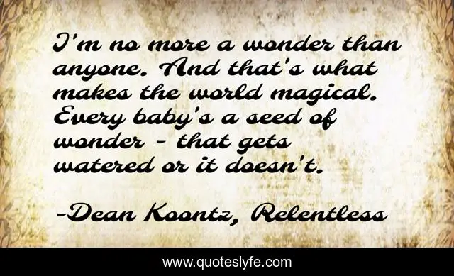 This page presents the quote "I'm no more a wonder than anyone. And that's what makes the world magical. Every baby's a seed of wonder - that gets watered or it doesn't.". Author of this quote is Dean Koontz, Relentless. This quote is about baby, potential, seed, wonder,.