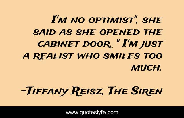 This page presents the quote "I'm no optimist", she said as she opened the cabinet door. " I'm just a realist who smiles too much.". Author of this quote is Tiffany Reisz, The Siren. .