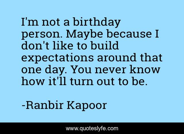This page presents the quote "I'm not a birthday person. Maybe because I don't like to build expectations around that one day. You never know how it'll turn out to be.". Author of this quote is Ranbir Kapoor. This quote is about day, expectations,.