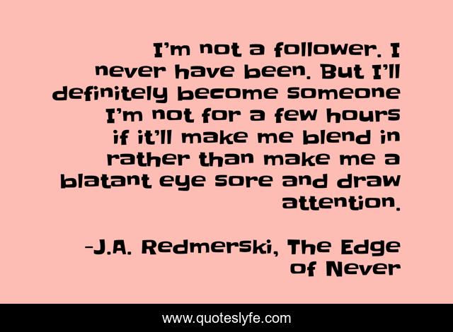 This page presents the quote "I’m not a follower. I never have been. But I’ll definitely become someone I’m not for a few hours if it’ll make me blend in rather than make me a blatant eye sore and draw attention.". Author of this quote is J.A. Redmerski, The Edge of Never. This quote is about hours, follower, attention, j-a-redmerski, the-edge-of-never,.
