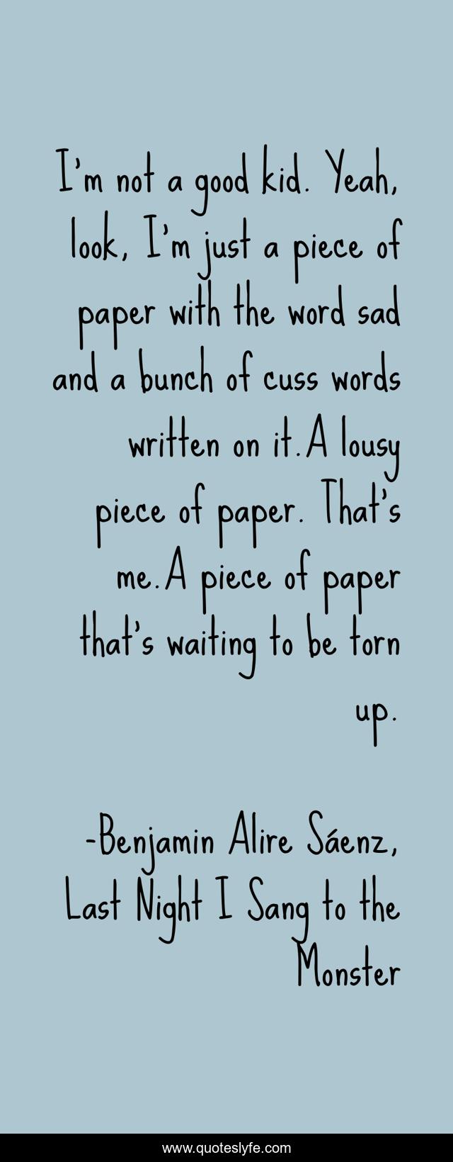 This page presents the quote "I’m not a good kid. Yeah, look, I’m just a piece of paper with the word sad and a bunch of cuss words written on it.A lousy piece of paper. That’s me.A piece of paper that’s waiting to be torn up.". Author of this quote is Benjamin Alire Sáenz, Last Night I Sang to the Monster. This quote is about loneliness, destructive, self-esteem,.