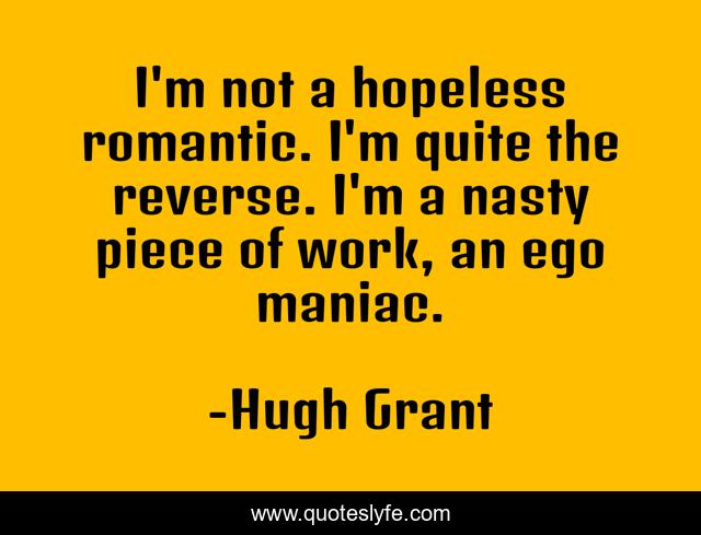 This page presents the quote "I'm not a hopeless romantic. I'm quite the reverse. I'm a nasty piece of work, an ego maniac.". Author of this quote is Hugh Grant. This quote is about ego, romantic, hopeless,.