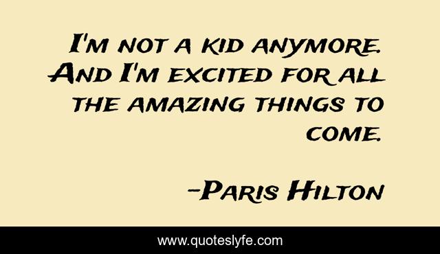 This page presents the quote "I'm not a kid anymore. And I'm excited for all the amazing things to come.". Author of this quote is Paris Hilton. This quote is about things, anymore, kid,.