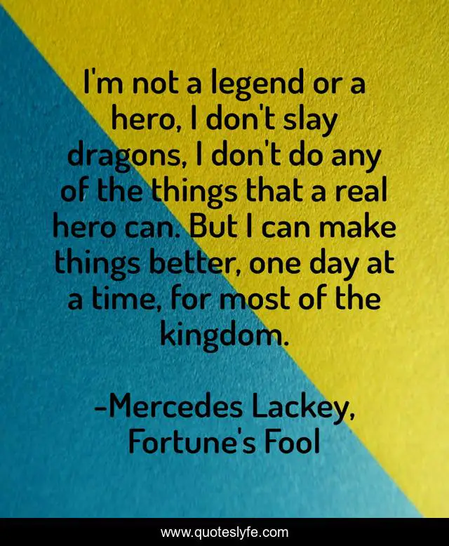 This page presents the quote "I'm not a legend or a hero, I don't slay dragons, I don't do any of the things that a real hero can. But I can make things better, one day at a time, for most of the kingdom.". Author of this quote is Mercedes Lackey, Fortune's Fool. This quote is about heroes, altruism, heroism,.
