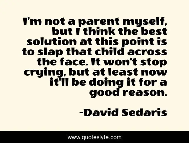 This page presents the quote "I'm not a parent myself, but I think the best solution at this point is to slap that child across the face. It won't stop crying, but at least now it'll be doing it for a good reason.". Author of this quote is David Sedaris. .