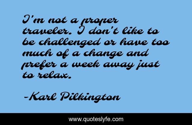This page presents the quote "I'm not a proper traveler. I don't like to be challenged or have too much of a change and prefer a week away just to relax.". Author of this quote is Karl Pilkington. This quote is about week, too much, relax,.